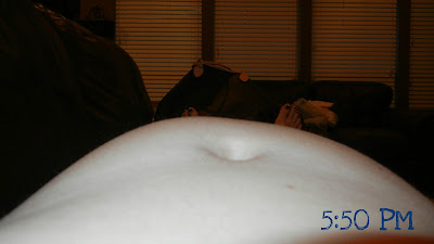 Hunter has been super active, although there was a day or two when I didn't feel him moving much, but I checked the heartbeat with the doppler and all was good. Early on, we could visibly see that he liked to squish into either one side or another, but for the past week or so, I am seeing that pattern again. Check this out from tonight:
